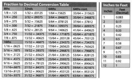 Tape Measures indicate whole numbers in inches and fractions of an inch in increments of 1/16"