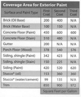 - Divide the remaining square feet by 350* to determine the number of gallons needed and increase this number by the amount of coats you plan to apply. (*Use the table below or check your paint can.