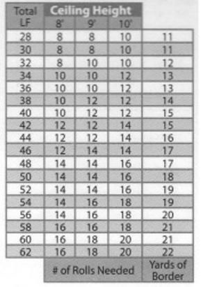 - Identify the corresponding number based on your ceiling height. (this is the number of rolls you will need.