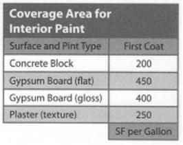 p>Example: Applying two coats, how many gallons of paint will you need for a room that is 12 x 14 with 9' ceilings? (Note: Total square foot of openings is 45).