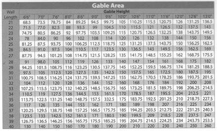 Example: What is Square Feet in the Gable Area of a 50' wide building with a 12' Gable Height? 1. GA = Gable Height x Run ÷ 2 2. GA = 12 x 25 ÷ 2 3. GA = 150 SF |